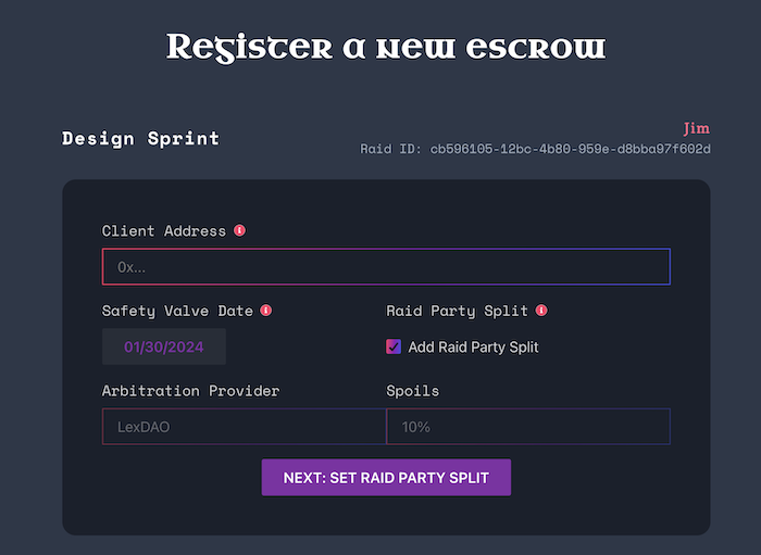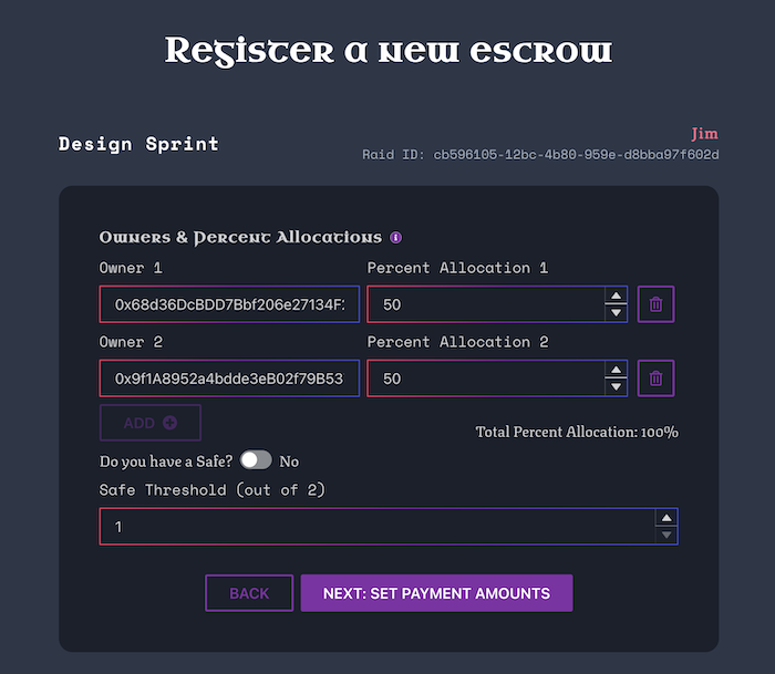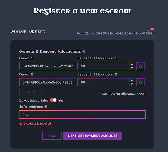 If you opted to create a raid (or RIP) party split in the previous step, you'll be asked to provide percentage splits for the first milestone to be released along with the raid party member addresses for each split percentage.